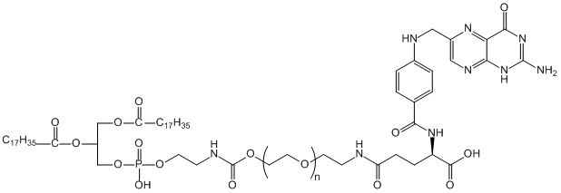 DSPE-PEG-FA (1,2-二硬脂酰-sn-甘油基-3-磷酸乙醇胺-N-聚乙二醇)是一種含有葉酸的PEG綴合物。由于DSPE-PEG-FA中含有的葉酸受體的表達(dá)水平遠(yuǎn)高于正常細(xì)胞,因此其含有的葉酸受體可特異性結(jié)合葉酸及其類似物。