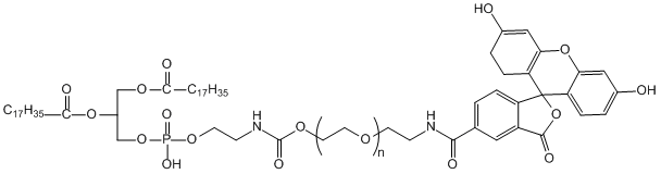 DSPE-PEG-FITC(1,2-二硬脂酰-sn-甘油基-3-磷酸乙醇胺-N-(聚乙二醇) - 熒光素(鈉鹽)是具有DSPE磷脂和熒光素FITC染料性能的線性異雙功能PEG化試劑。