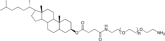 CLS-PEG-NH2(膽固醇聚乙二醇胺)是一種具有良好水溶性的親脂性脂質PEG綴合物。PEG膽固醇衍生物可用于制備脂質體以改善包封藥物的循環時間。它們也可用于非病毒轉染試劑。