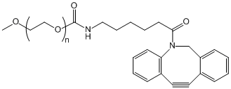 mPEG-DBCO(甲氧基聚乙二醇二苯并環辛烯)是一種聚乙二醇化DBCO(二苯并環辛炔)衍生物,在沒有任何金屬催化劑的狀態下mPEG-DBCO可以與疊氮基產生一種生物可加工的反應反應,其能夠使兩種分子在水溶液中綴合。